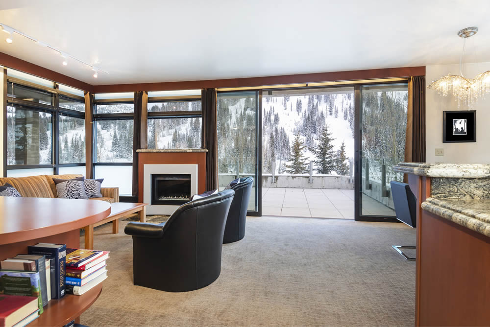 Located on the second floor, the suite has a heated private deck with a full mountain view and a small kitchen and dining area.